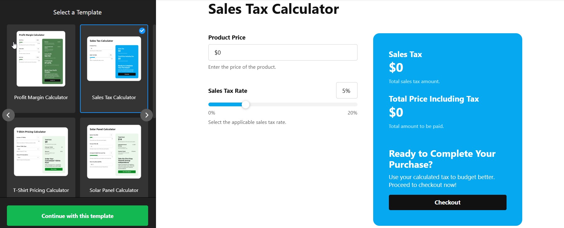 There are also widget developers offering calculators you can fully customize. For example, here’s a screenshot of a tax calculator template from our Webflow Calculator widget at Elfsight. You can tweak it with drag-and-drop fields, or just describe what you want and have the widget generate it using a built-in AI feature.