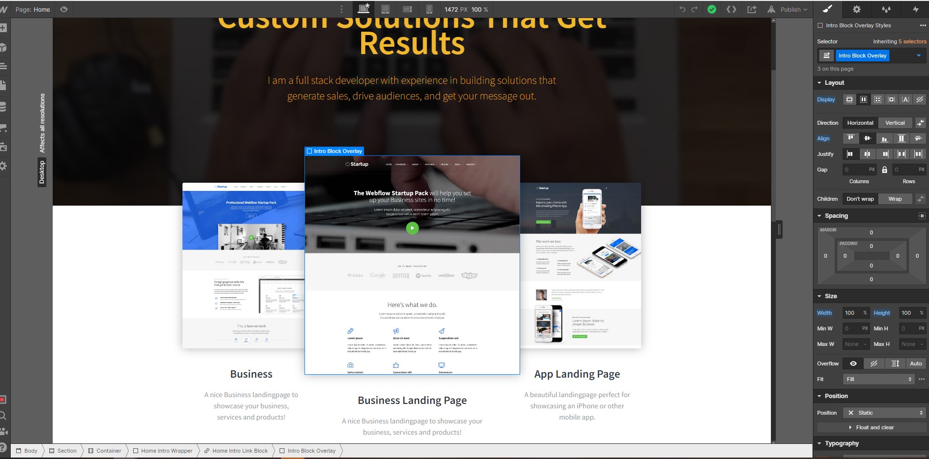 These images are actually set as background images on the ‘Home Intro Link Block’ elements rather than the Intro Block Overlay, you can select these elements in the Navigator on the left and then change the background image here: