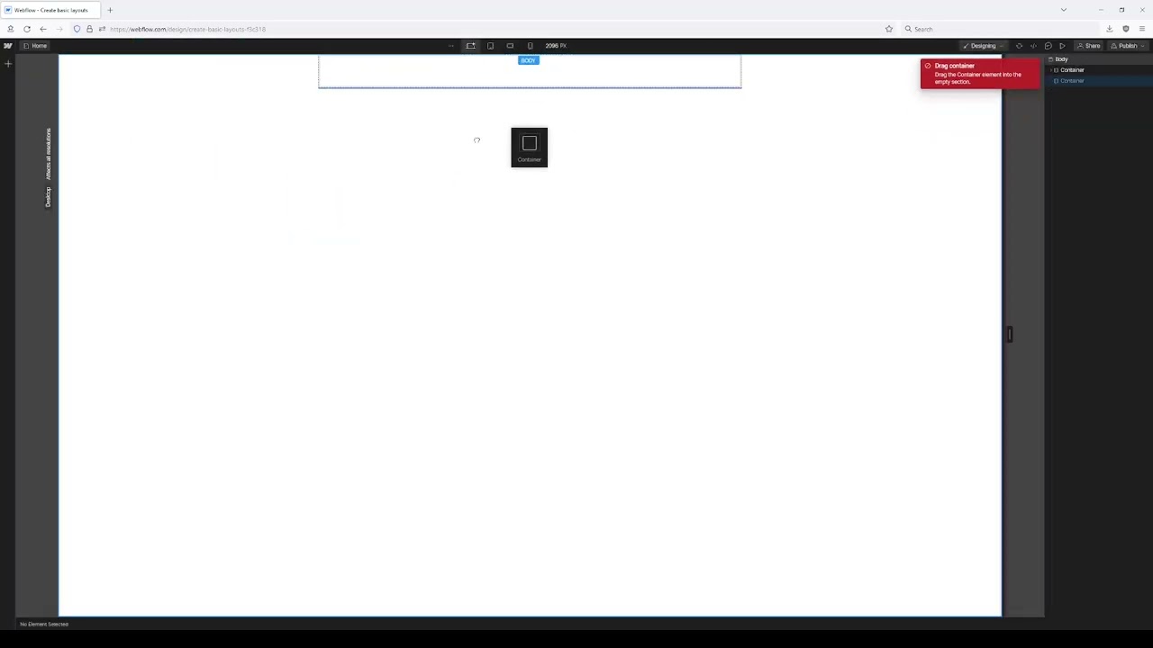 I just signed up for Webflow and entered the tutorial. It tells me to “Drag a Container to the page”. When I do that, a red error message pops up: