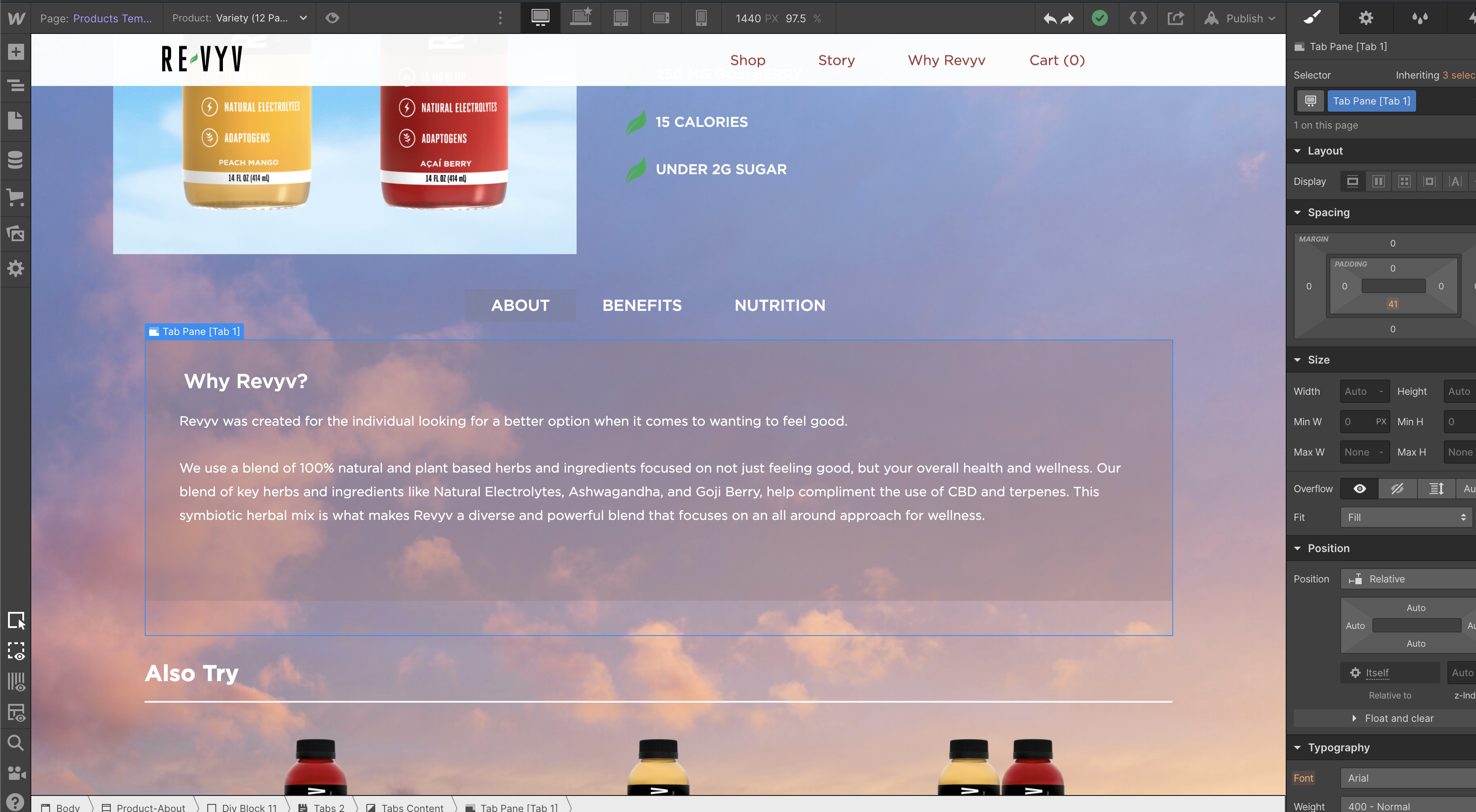 I can’t say for sure why the first tab is working properly while the others aren’t, although you’re giving the Product-About div margin: auto on either side causing it to shrink. Removing this fixes the issue: