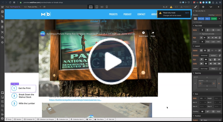 I’m pretty new to Webflow and have been trying to create a tabbed menu that functions like steps for a DIY tutorial. The tabs are linked to a CMS and eventually, I will have the steps (tabs) conditionally dependent on the number of steps that have been entered.
