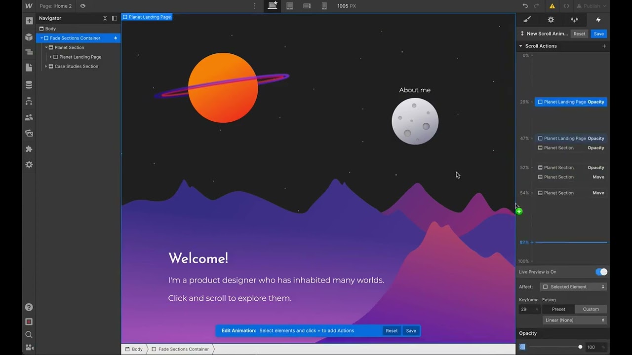 - The first opacity fade will be applied to div “Planet landing page”