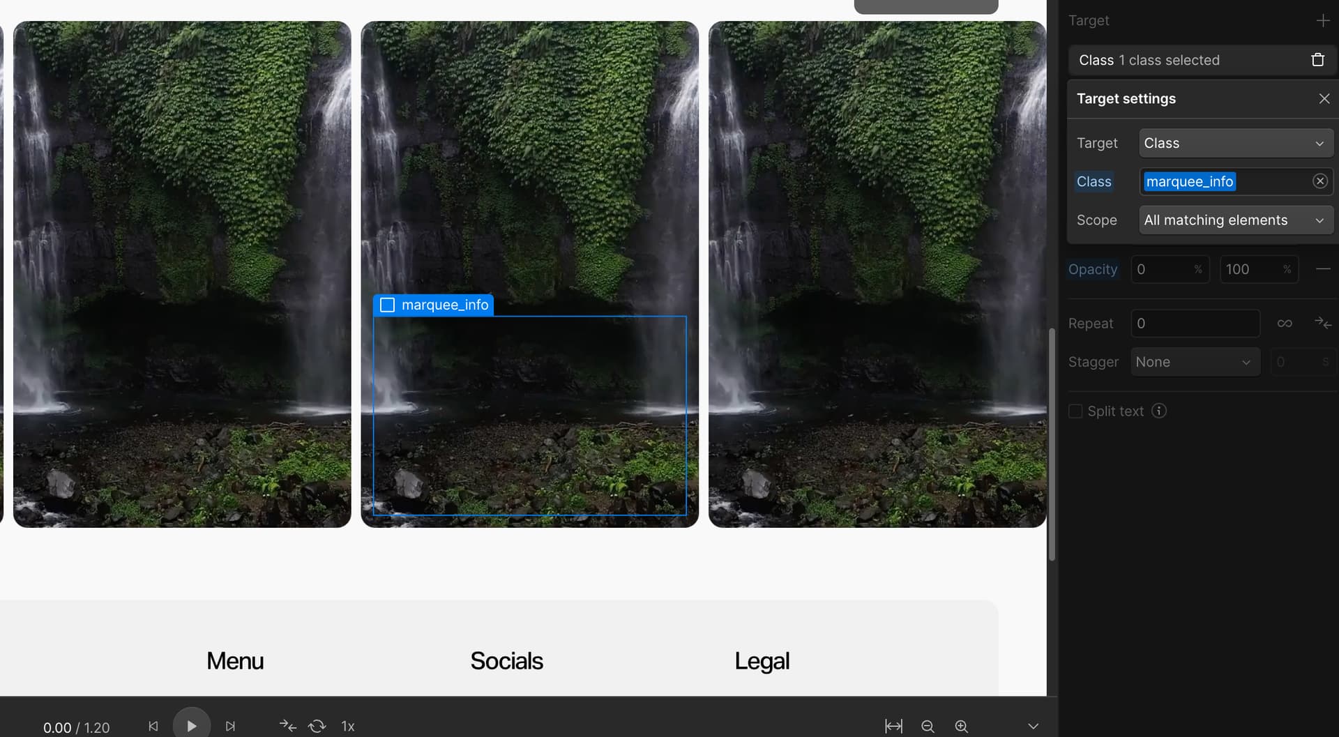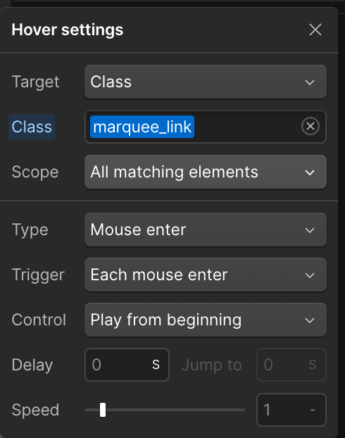 So yeah, when I hover on marquee_link I need the marquee_info child to change from 0 to 100 opacity, however it always does it for all of them… I think the problem is the target, but selecting any other scope doesn’t actually do anything…