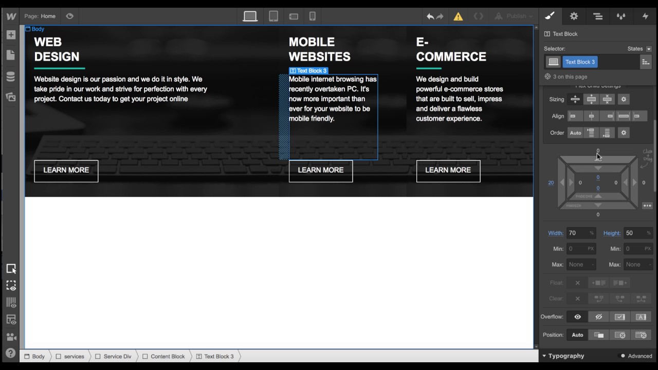 I would do this: set the positions of the text boxes and services headings to auto and reduce the bottom margin of the heading. You’ll notice that this will bring the copy up. Probably the most straightforward way to get it where you want it is to adjust the top padding of the service div blocks (although there are other solutions as well).