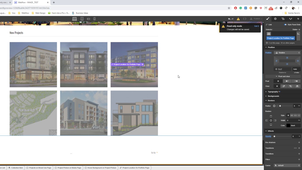 On the not working correctly version 2. On rollover/hover the project name and location show up with transparency / when rollover/hover transparency goes off and name stays there