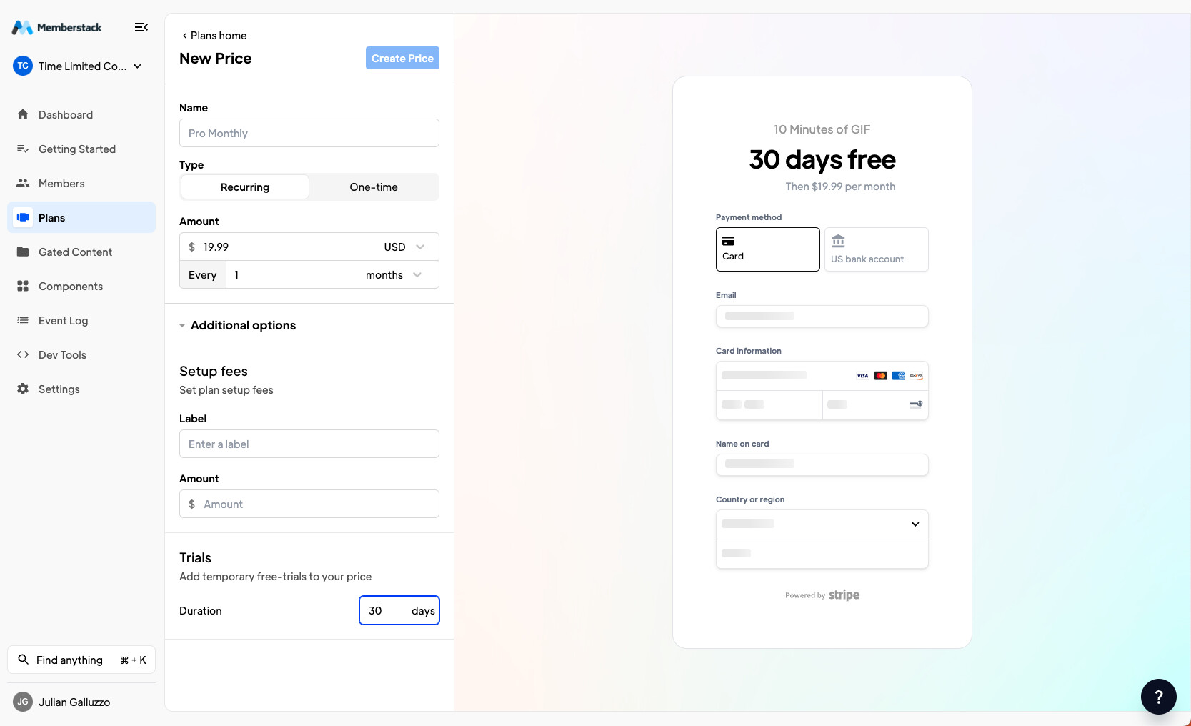 We sell a membership where we ship one physical product a month. It costs $19.99. We want to offer a free trial where the first month is free and then $19.99 thereafter. We want it to automatically convert to a paid membership. Here is the ideal situation. The users inputs all credit card and shipping information to sign up for the first month for free. Then 30 days after, they would be charged $19.99 for the first time. From thereafter they would continuously be charged $19.99/month.