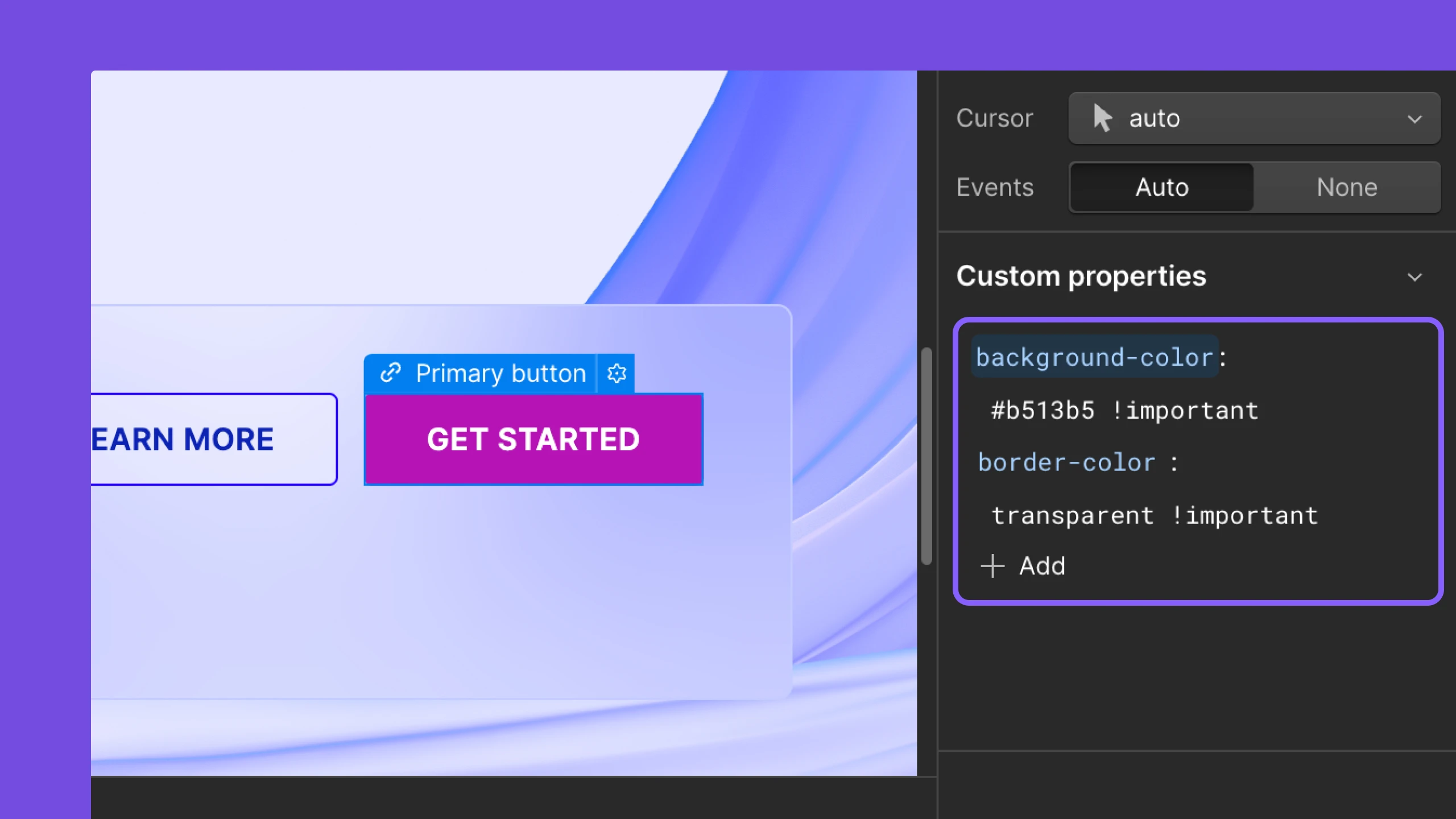 The Custom properties section in the Designer Style panel now supports the CSS !important flag. You can append !important to any value, for any property available in Webflow custom properties. Adding the flag will enable these custom styles to “win” over other (non-!important) styles applied to the element.