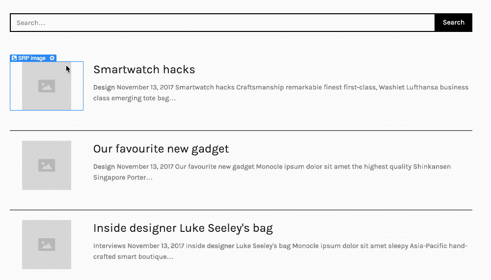You can use the search description field to add additional information to your search results. For example, say you want to show visitors what type of content a specific search result by displaying the blog post category alongside the result.