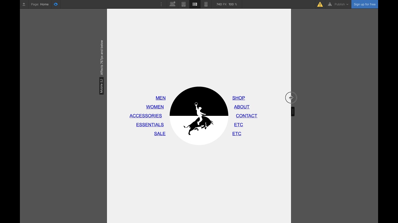 First column has five links, placed with grid areas, and right-aligned using the grid alignment properties. The middle three text links have 1vw, 2vw, and 1vw of padding on their right side to follow the circle shape.