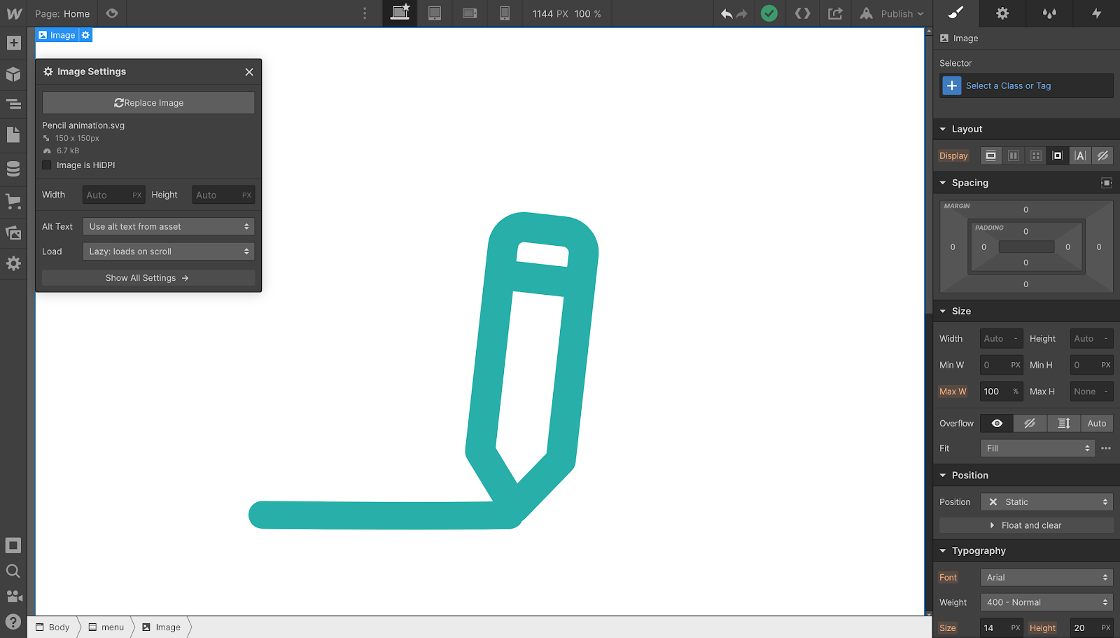 - Because it’s not an interactive SVG, you can add it to Webflow’s assets panel and drag it into your project.