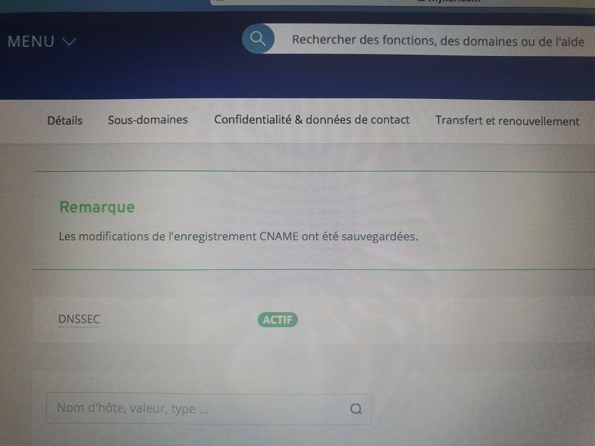 J’ai refait l’action. Et je vois le message " les modifications de l’enregistrement CNAME ont été seuvgardees. Seuf que le “.” n’apparaît pas sur le tableau DNS…